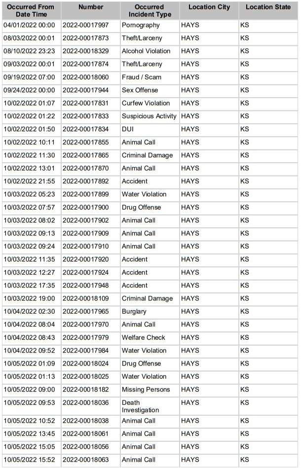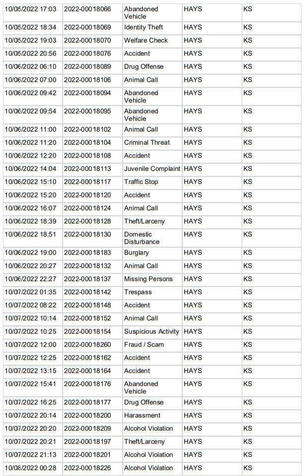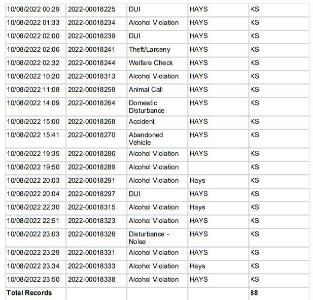 The Hays Police Department responded to 88 calls from Oct. 2 through Oct. 8, 2022 according to the HPD Activity Log.