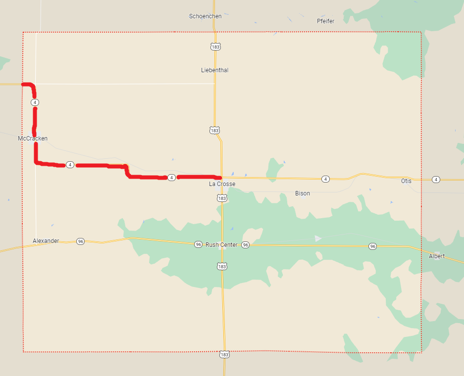 The Kansas Department of Transportation project involves crack repair on K-4 from the Ness/Rush county line to the junction with U.S. 183. The length is 19 miles.