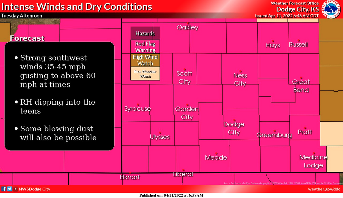 The National Weather Service has issued a red flag warning for most of northwest Kansas beginning at noon Tuesday and extending into Tuesday evening.