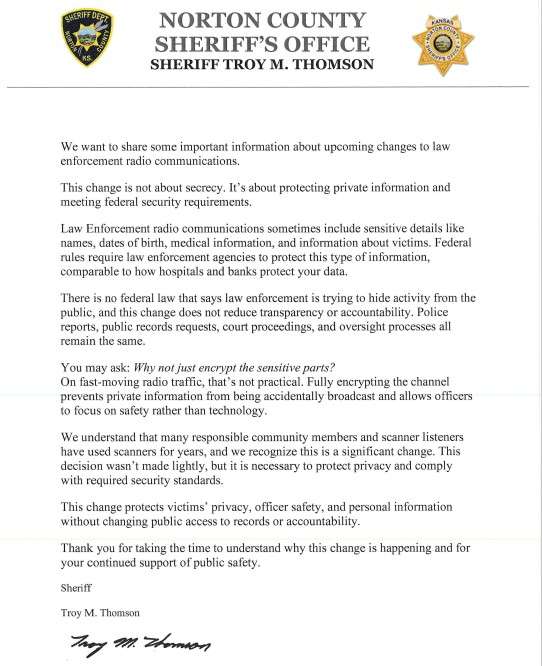 As of the beginning of the year, the Norton County Sheriff's Department has encrypted its radio traffic, so the public can no longer hear it on a police scanner.