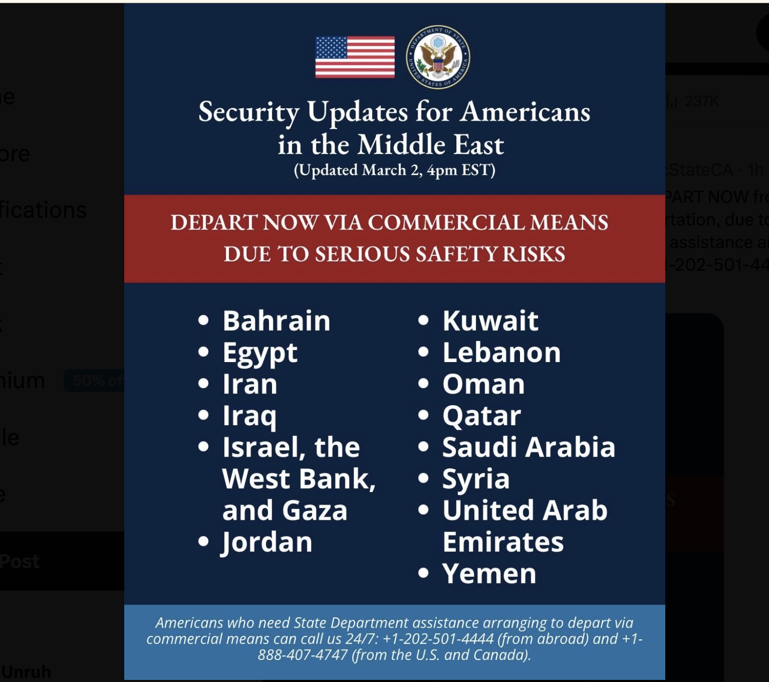 Americans who need State Department assistance arranging to depart via commercial means, CALL US 24/7 at +1-202-501-4444 (from abroad) and +1-888-407-4747 (from the U.S. and Canada). ENROLL in http://step.state.gov to get the latest security updates from the nearest U.S. embassy or consulate.