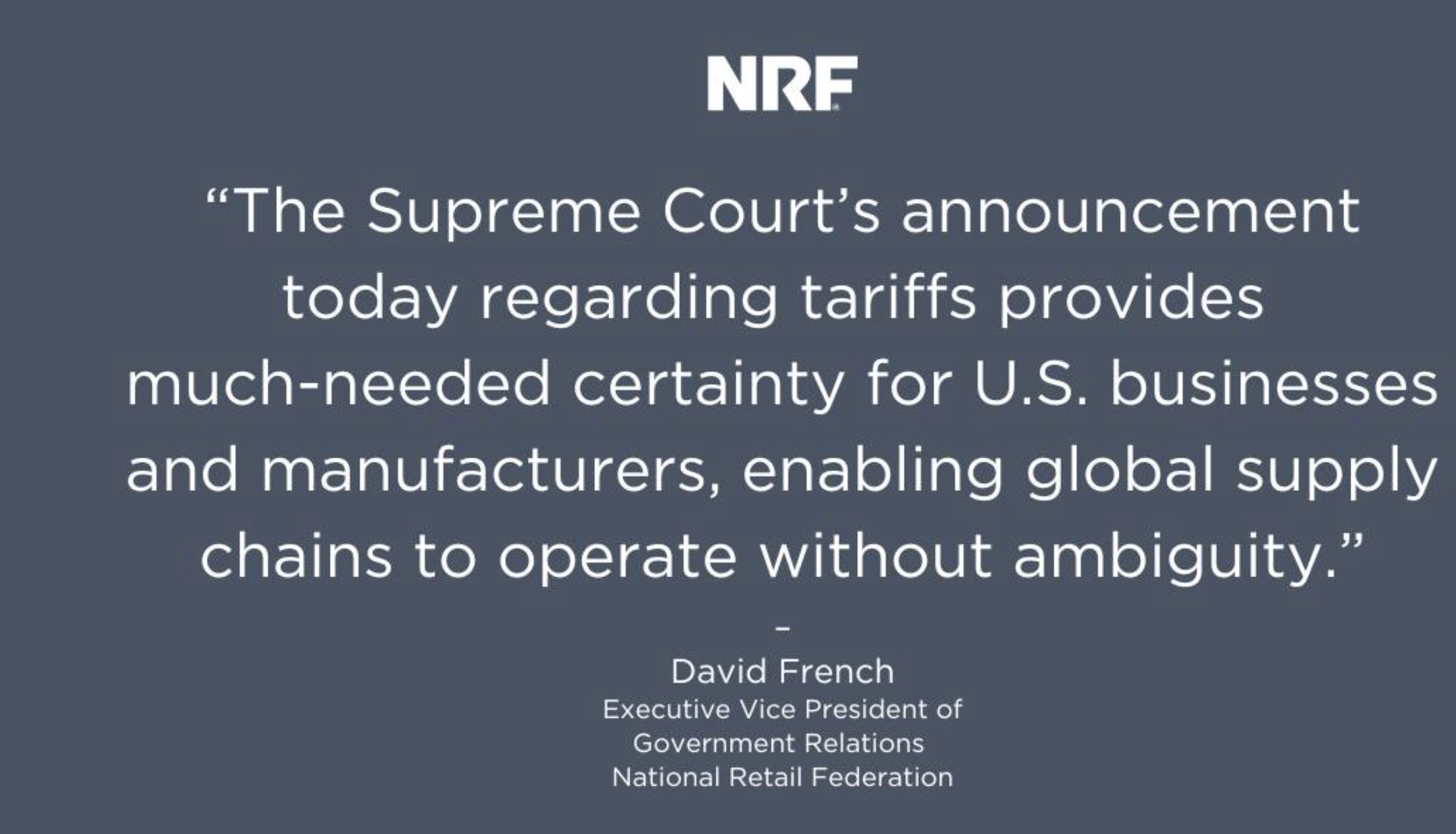 WASHINGTON – The National Retail Federation today issued the following statement from Executive Vice President of Government Relations David French in response to the Supreme Court’s ruling regarding the Trump administration’s use of the International Emergency Economic Powers Act to impose tariffs.