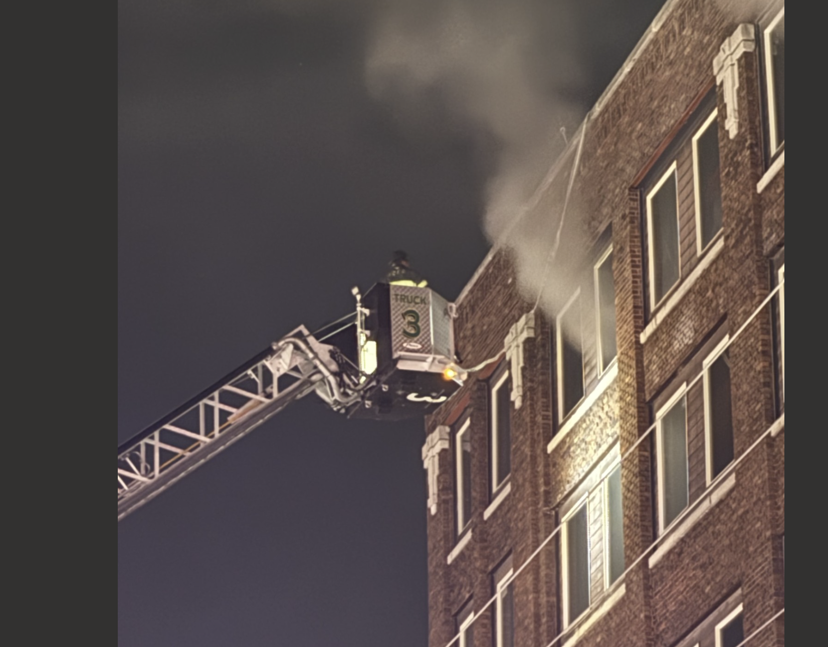 The fire was found to be in an open elevator shaft and burning on the roof of the structure.