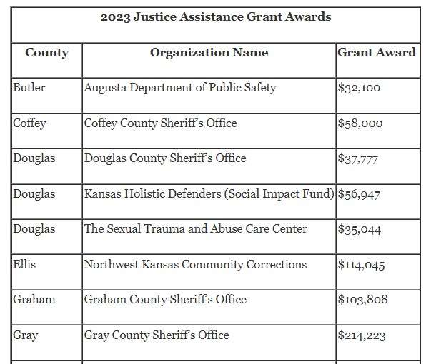 TOPEKA — Governor Laura Kelly announced her administration is awarding nearly $2.4 million to 27 Kansas agencies, including in Ellis, Graham and Rush counties, to strengthen law enforcement, prevent crime, and support crime victims.