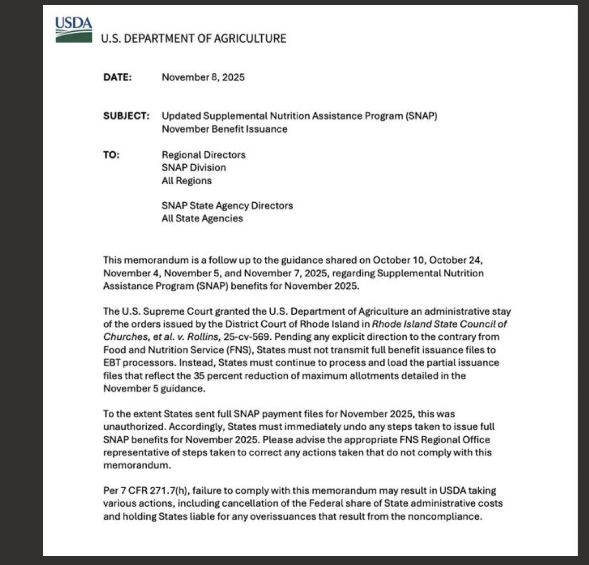 “To the extent States sent full SNAP payment files for November 2025, this was unauthorized,” Patrick Penn, deputy undersecretary of Agriculture, wrote to state SNAP directors. “Accordingly, States must immediately undo any steps taken to issue full SNAP benefits for November 2025.”