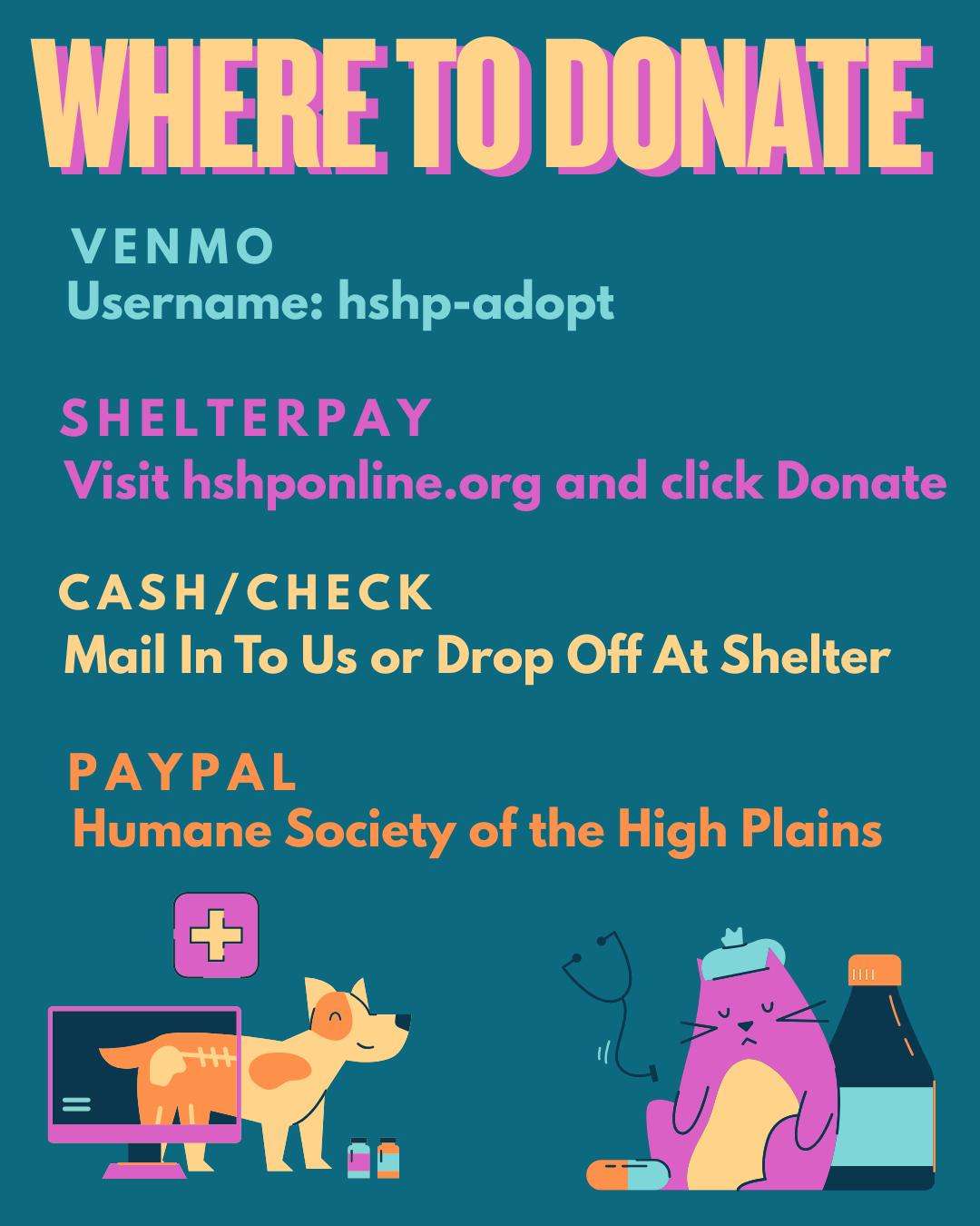 If you wish to mail a check, you can send those donations to Humane Society of the High Plains, P.O. Box 311, Hays, KS 67601.