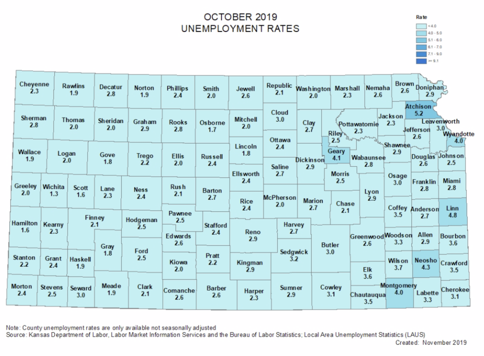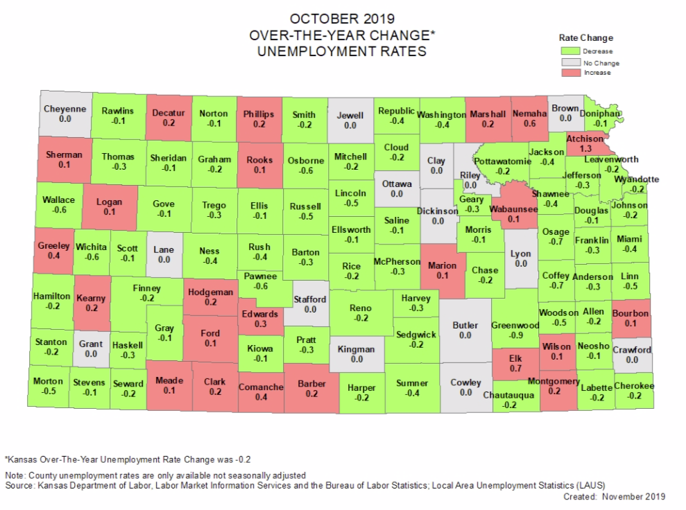 “Kansans can recognize two important milestones this month. The unemployment rate fell to 3.1 percent in October, the lowest rate in 40 years. April 1979 was the last month the unemployment rate was 3.1 percent," said Secretary Delía García. "Additionally, October established a record high level in the number of Kansans working."