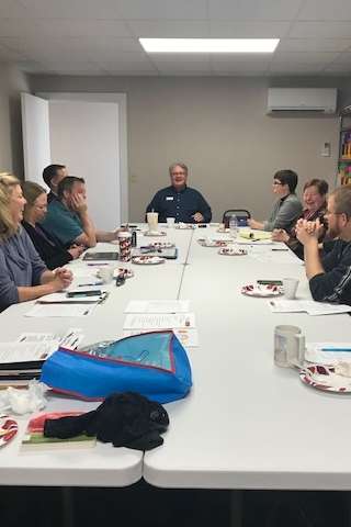 First Call for Help accepts a $25,000 donation from the Ministerial Alliance. Left to right: Mike Rose, First United Methodist Church and ECMA president; Dave Buller, North Oak Community Church and ECMA vice president; Linda Mills, First Call for Help executive director; Marie Sager, Trinity Lutheran Church; and Michael Drees, First Call for Help board president. The donation was used to remodel First Call's conference room.