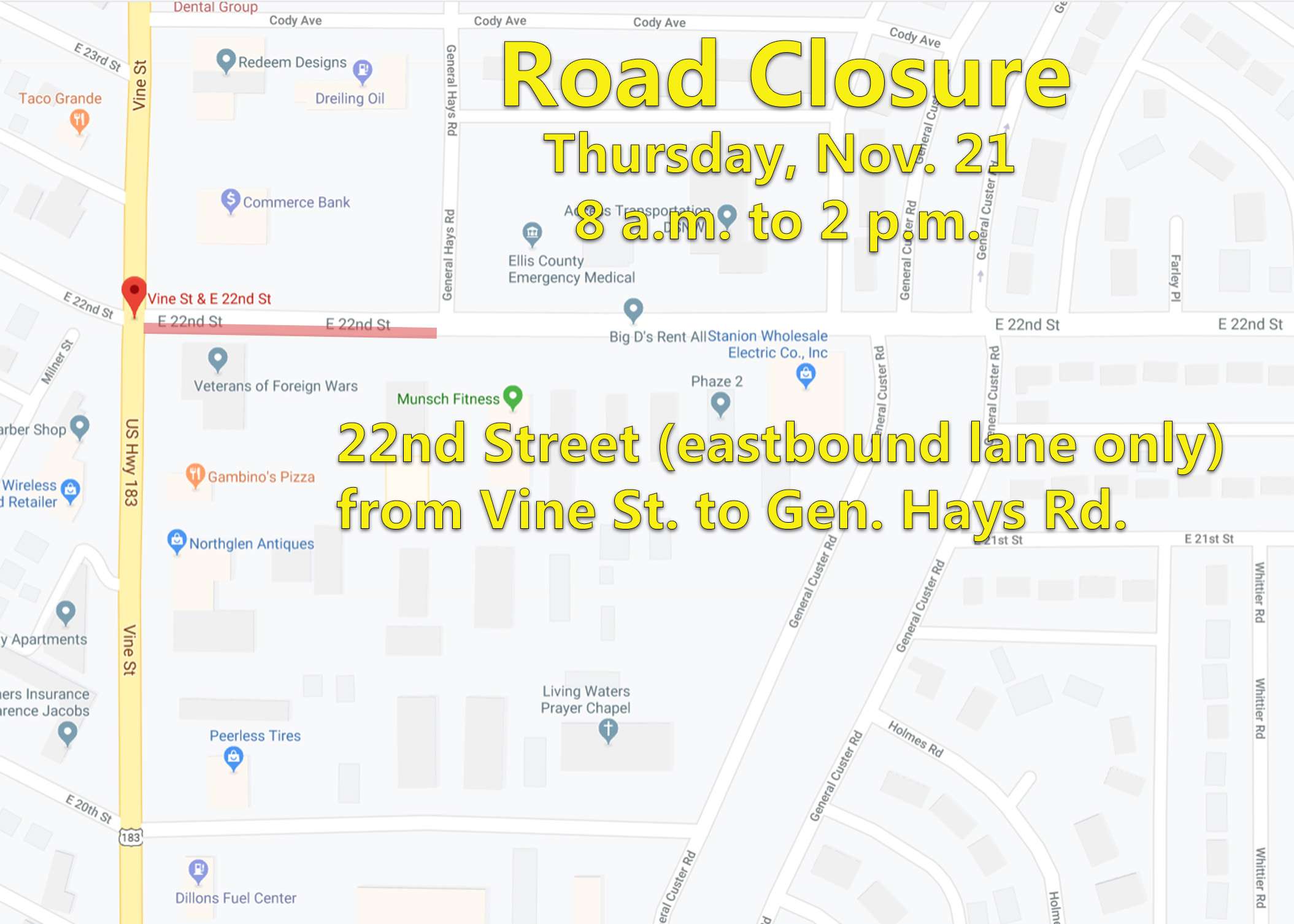 The eastbound lanes of 22nd Street, from Vine Street to General Hays Road, will be closed from 8 a.m. to 2 p.m. Thursday to allow Midwest Energy crews to change out a pole at the VFW.