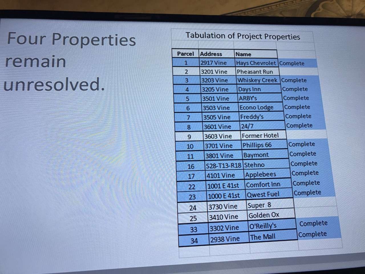 Four property owners have not yet reached an agreement with the city of Hays for acquisition of easements and rights of way necessary for the North Vine Street Corridor Improvement Project.