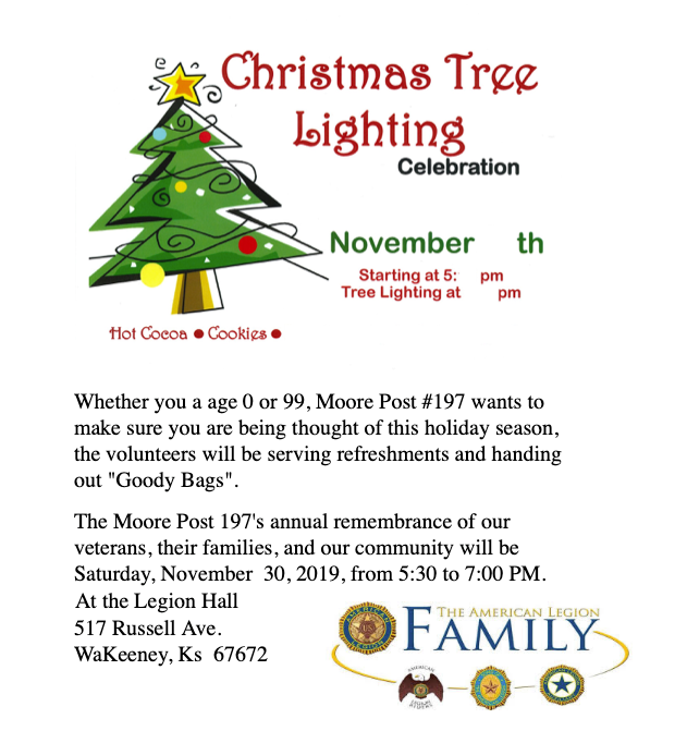 WAKEENEY — American Legion Moore Post 197 will be serving refreshment, hot chocolate and coffee at the Christmas tree lighting ceremony.