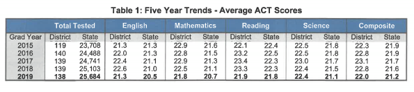 She said the scores in 2018-19 took a dip, but the district had more students taking the ACT because the state offered to pay for all students to take the test.