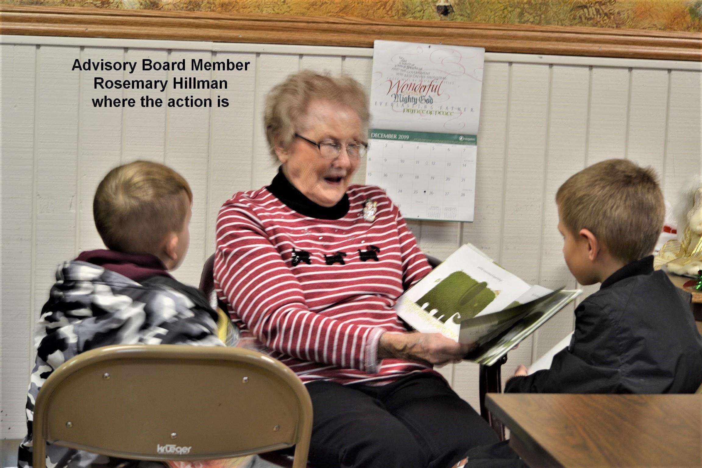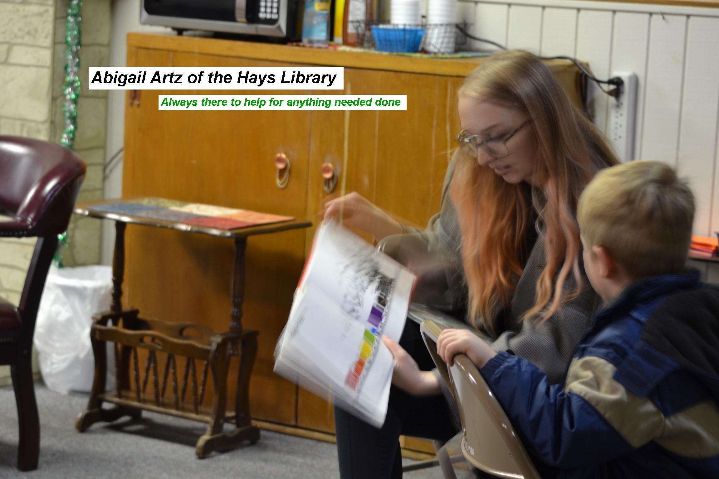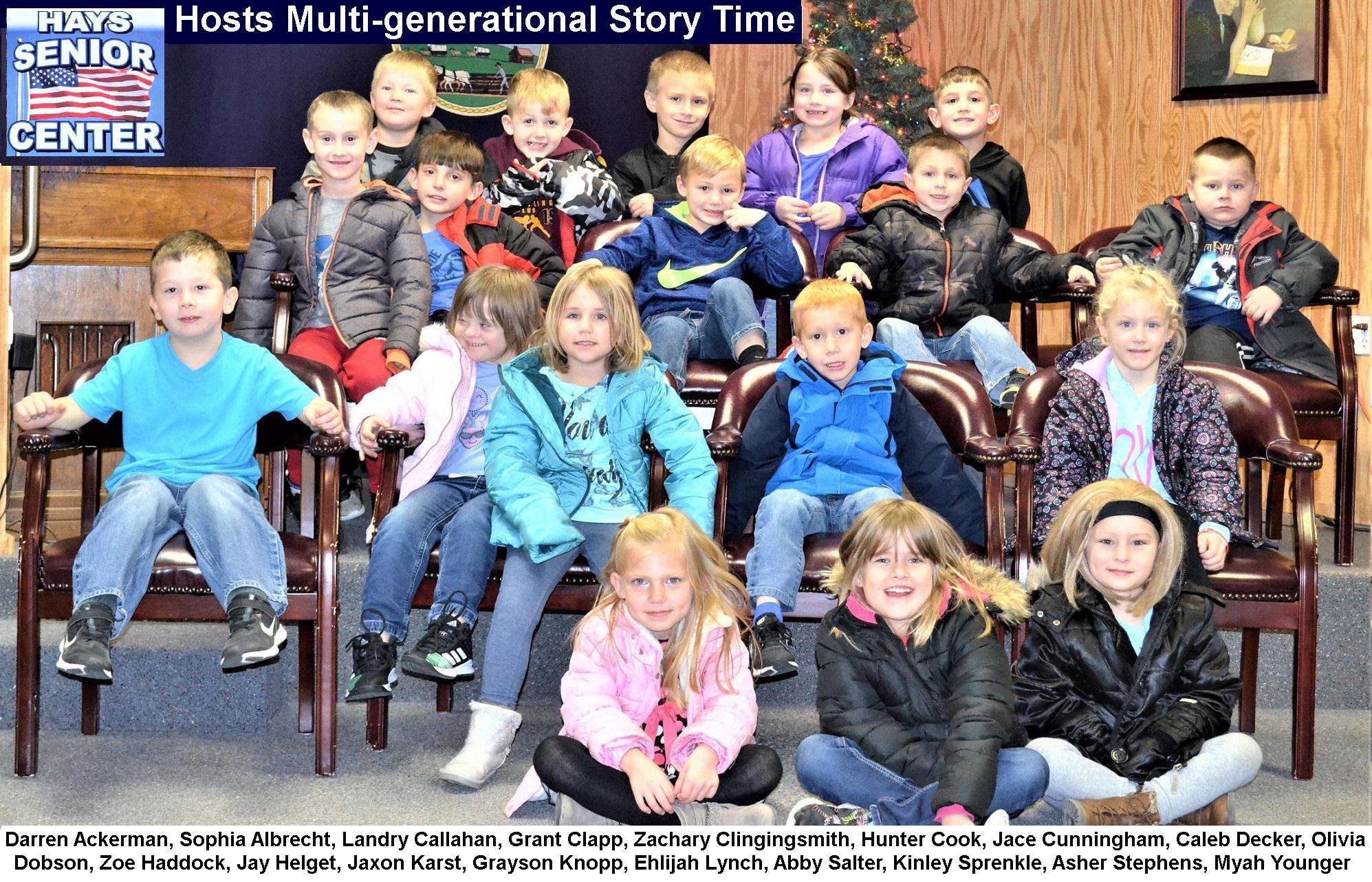 When Samantha Gill of the Hays Public Library approached the Board of the Hays Senior Center about putting on a “Story Time” reading program to include the patrons of the center, it was met with praise and approval. From this go-ahead the library made contact with Misty Lohmeyer, a teacher at the Hays Roosevelt School, who arranged for transportation of 18 young students to come to the center.