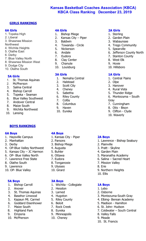 The Kansas Basketball Coaches Association has released their final set of rankings for the 2019 Calendar year. Several area teams are represented inside the top-10.