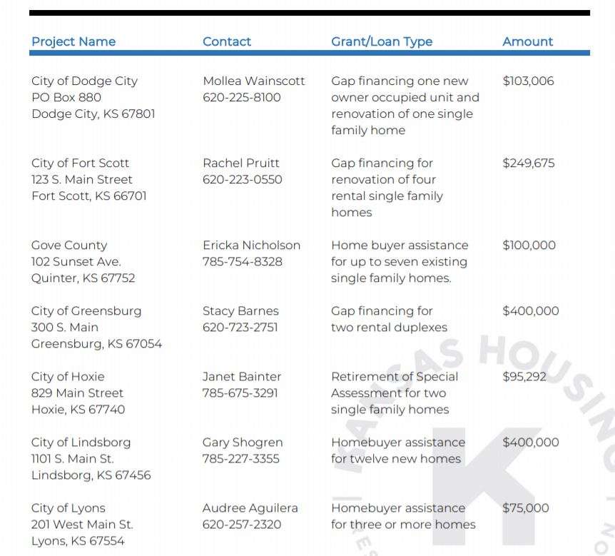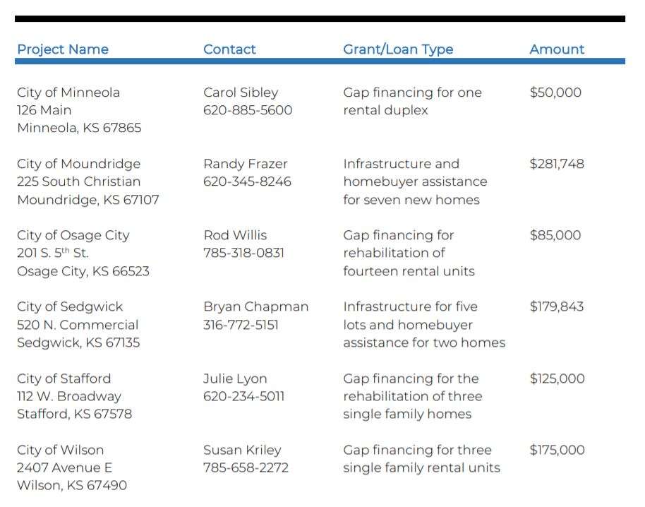 The funding, made possible through the state of Kansas’ Moderate Income Housing (MIH) program and supplemental Kansas Housing funding, awards grants or loans to develop multi-family rental units, single family homes, and water, sewer, and street extensions in cities or counties with populations of fewer than 60,000.