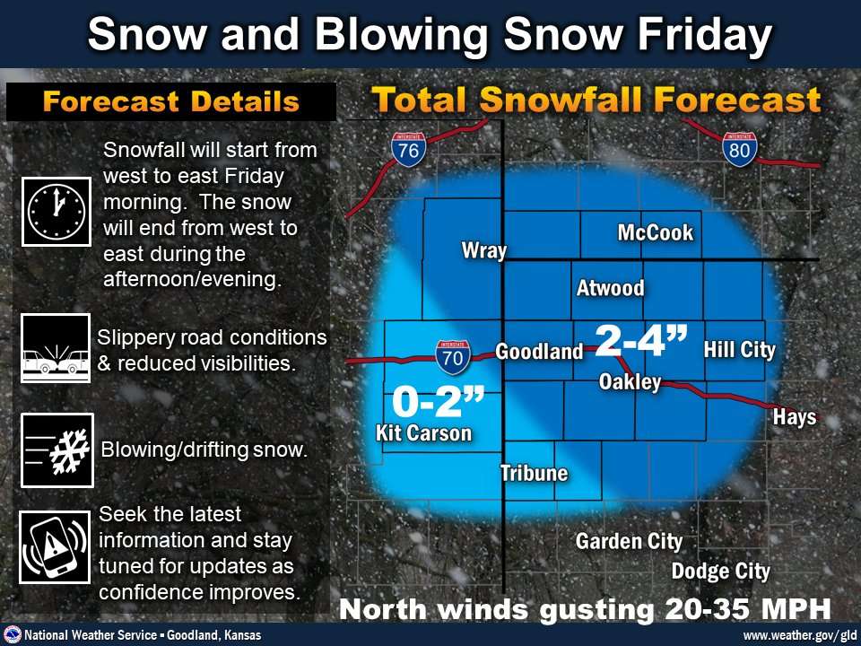 Farther northwest, the NWS in Goodland is warning of up to 4 inches of snow in its coverage area, which could lead to blowing or drifting snow and poor road conditions.