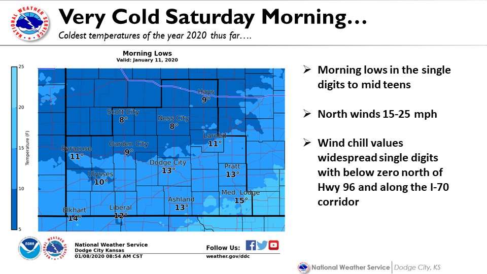 According to the National Weather Service in Dodge City, there is a 30 percent to 60 percent chance of snow beginning after noon Friday and continuing into Friday night.