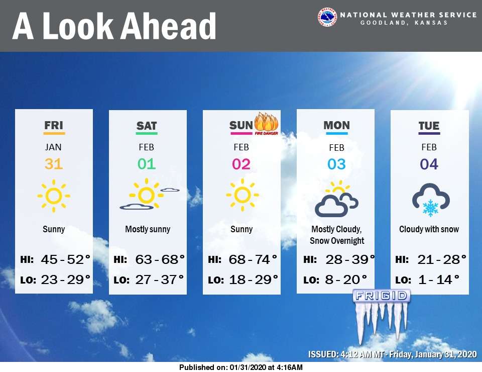 The National Weather Service in Dodge City is forecasting an unseasonably warm weekend to open February, with a high of 62 degree predicted Saturday and the mercury rising all the way to 70 by Super Bowl Sunday.