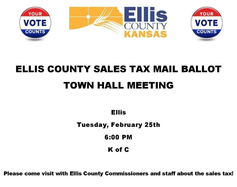 ELLIS — There will be a town hall to discuss a proposed Ellis County sales tax ballot issue at 6 p.m. Tuesday at the Ellis Knights of Columbus hall.
