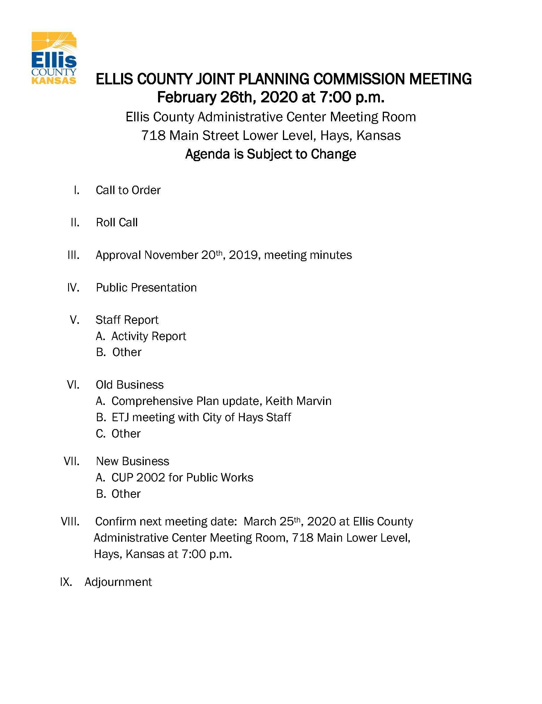 The Ellis County Joint Planning Commission will hold its monthly meeting on Wednesday along with a public hearing.