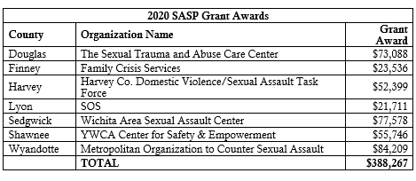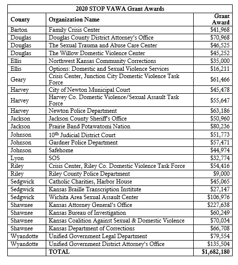 “I’m proud to announce more than $2 million grants awarded to our Kansas communities,” Kelly said. “These grants provide essential services to survivors and strengthen our support systems throughout the state. Many victims – oftentimes women – experience serious, life-threatening situations. These crimes are far reaching and pervasive in our society and it is our responsibility as leaders to do all we can to ensure the safety of our families, friends and our communities.”