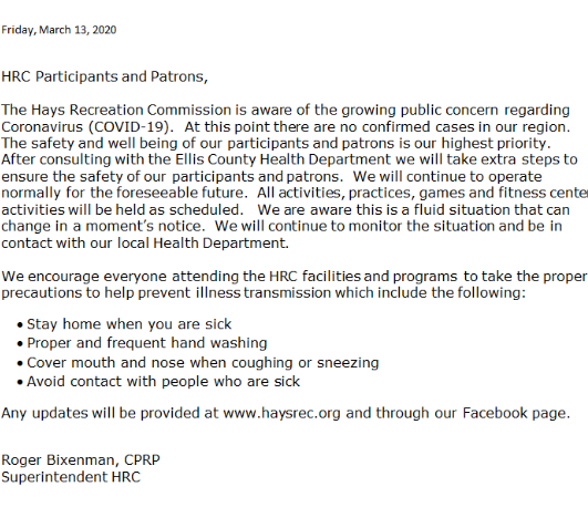 HRC issues letter regarding coronavirus caution