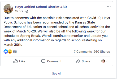 The Hays school district has canceled classes and all school activities from March 16-20 because of risk of spread of the COVID-19 virus.