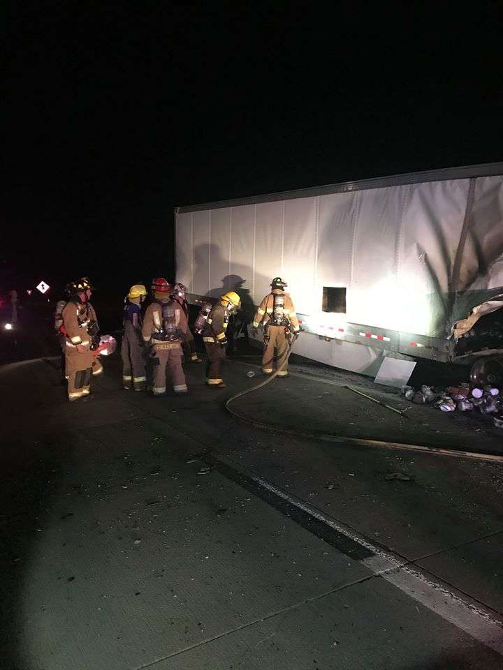 The fire was knocked down and there were no injuries. HazMat Response from Kansas City responded to the scene to do cleanup. Traffic was initially reduced down to one lane eastbound but the trailer was unloaded on Sunday and removed while eastbound traffic was restored to two lanes about 6 p.m.