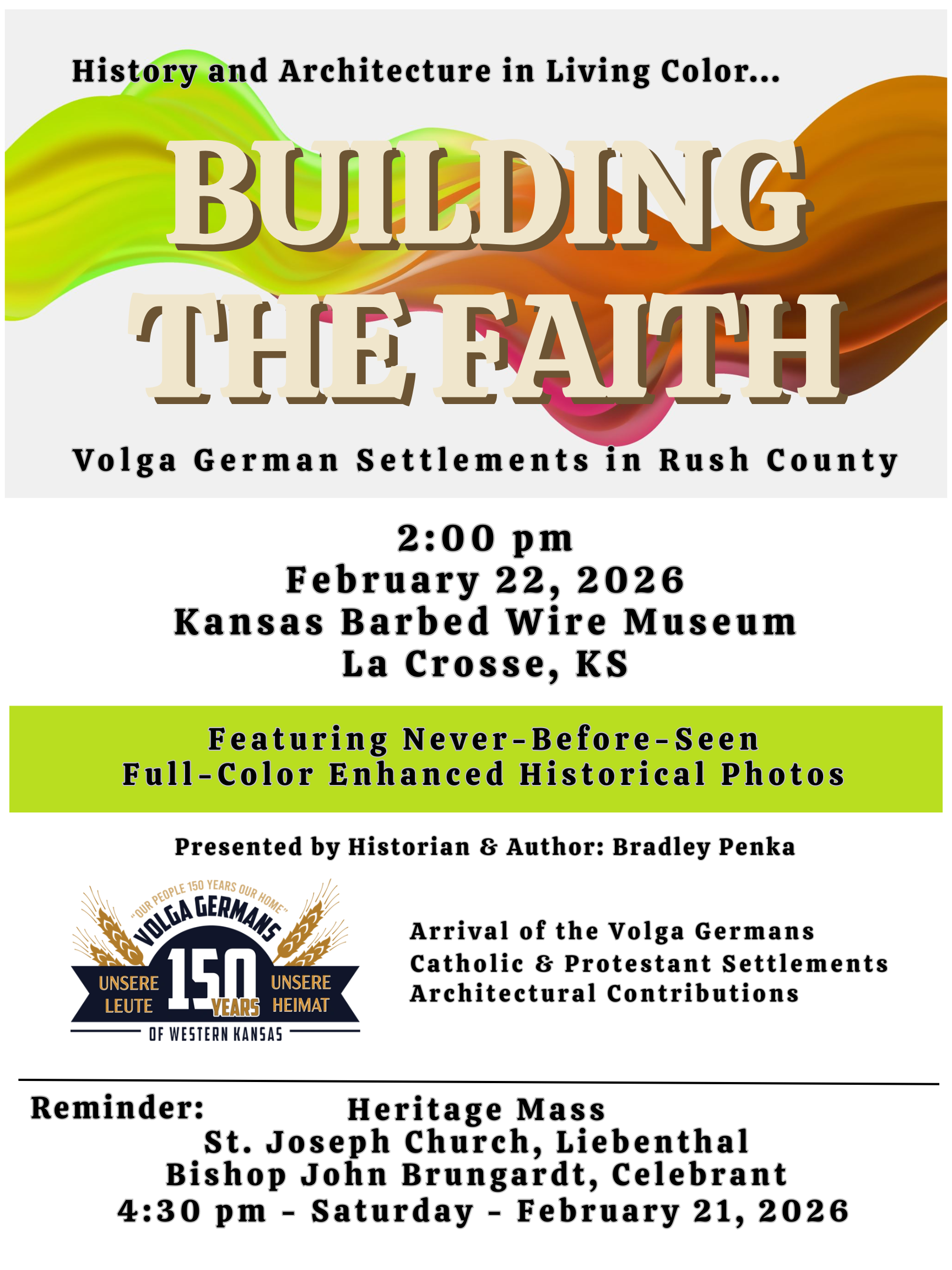 On Sunday, February 22, 2026 there will be a special presentation about the Volga German settlements of Rush County, Kansas, "Building the Faith - Volga German Settlements in Rush County."