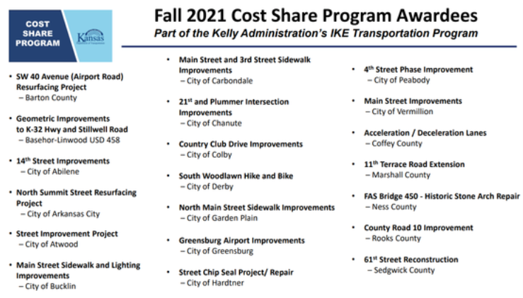 “These 20 new Cost Share projects will repair and modernize transportation infrastructure in communities across Kansas,” Kelly said. “I want to congratulate all of the communities that were awarded projects and thank them for their collaboration in this program. My administration is committed to fixing and maintaining our roads and bridges in every corner of the state.”