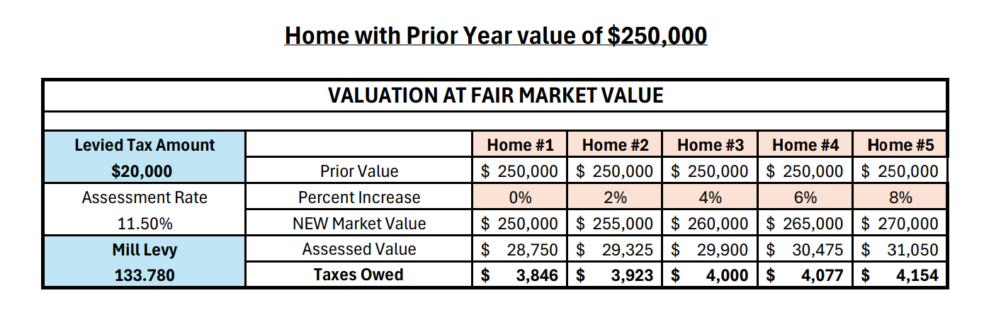New market values ranged from $250,000 to $270,000. Using an established mill levy of 133.780 to raise $20,000 in taxes, the taxes owed from each home ranged from $3,846 to $4,154.