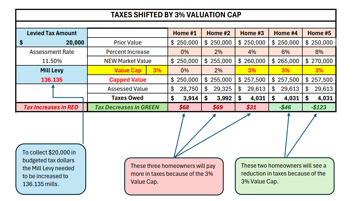 Homes four and five, which increased 6% and 8% in market value, were capped at 3%. To maintain the same $20,000 in total revenue, the mill levy had to be raised to 136.135 mills.