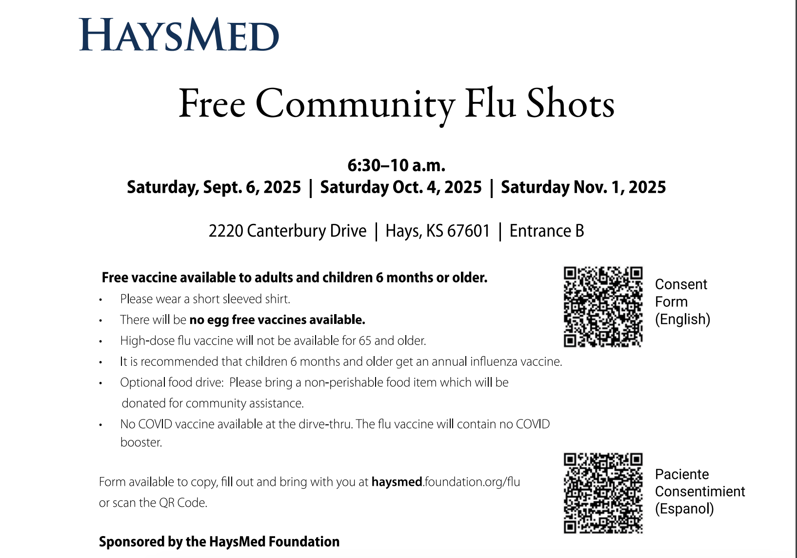 · Consent forms available at haysmedfoundation.org/flu – please complete, print, and bring a signed copy for each person being vaccinated