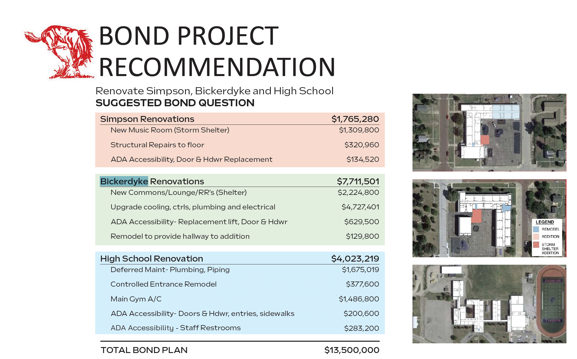 The bond would pay for $7.7 million in improvements at Bickerdyke Elementary, including new commons that would double as a storm shelter, upgrading cooling, pumping, and electrical systems, accessibility improvements, and a remodel to provide a hallway to the new addition.