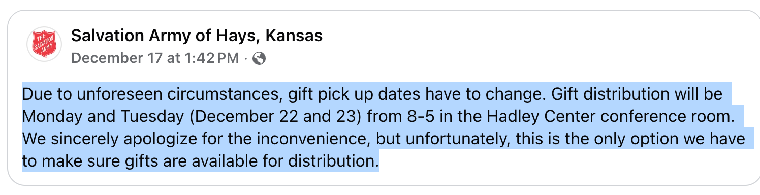 Hays Angel Tree gift pick up delayed
